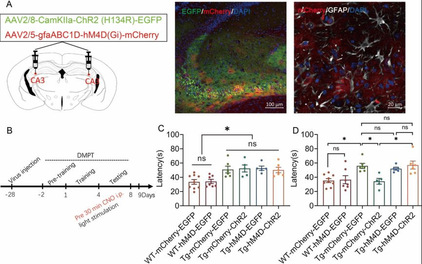 阿尔兹海默病(Alzheimer’s Disease, AD)是一种神经退行性疾病,主要出现在老年人群,临床上主要表现为记忆力衰退、认知功能障碍。随着社会步入老龄化,AD受到广泛关注,然而AD的发病机制不明。海马CA3参与空间记忆的编码和回溯,CA3区突触可塑性在早期阿尔兹海默病(AD)中受损。光遗传学技术可高时空精度调控细胞的活动性,实时调控动物行为,先前研究发现光遗传学激活海马DG区和CA1区神经元可改善AD空间记忆行为。该工作聚焦CA3区锥体神经元(PNs),利用动物行为学、光遗传学、电生理学、转录组学、分子生化等技术,发现光遗传学激活CA3 PNs显著恢复AD小鼠受损的空间短期记忆,这种激活增强了突触密度/强度和突触可塑性,并激活了星形胶质细胞。利用化学遗传抑制 CA3 星形胶质细胞的活性逆转了 CA3 PNs 的光遗传学刺激效应,降低突触密度和强度,降低突触蛋白和GluA3/4,从而破坏 APP/PS1 小鼠的认知恢复。该工作揭示了 CA3 PNs 光遗传学激活恢复 APP/PS1 小鼠空间短期记忆的分子机制,这为操纵 CA3 治疗 AD 提供了潜在策略。
