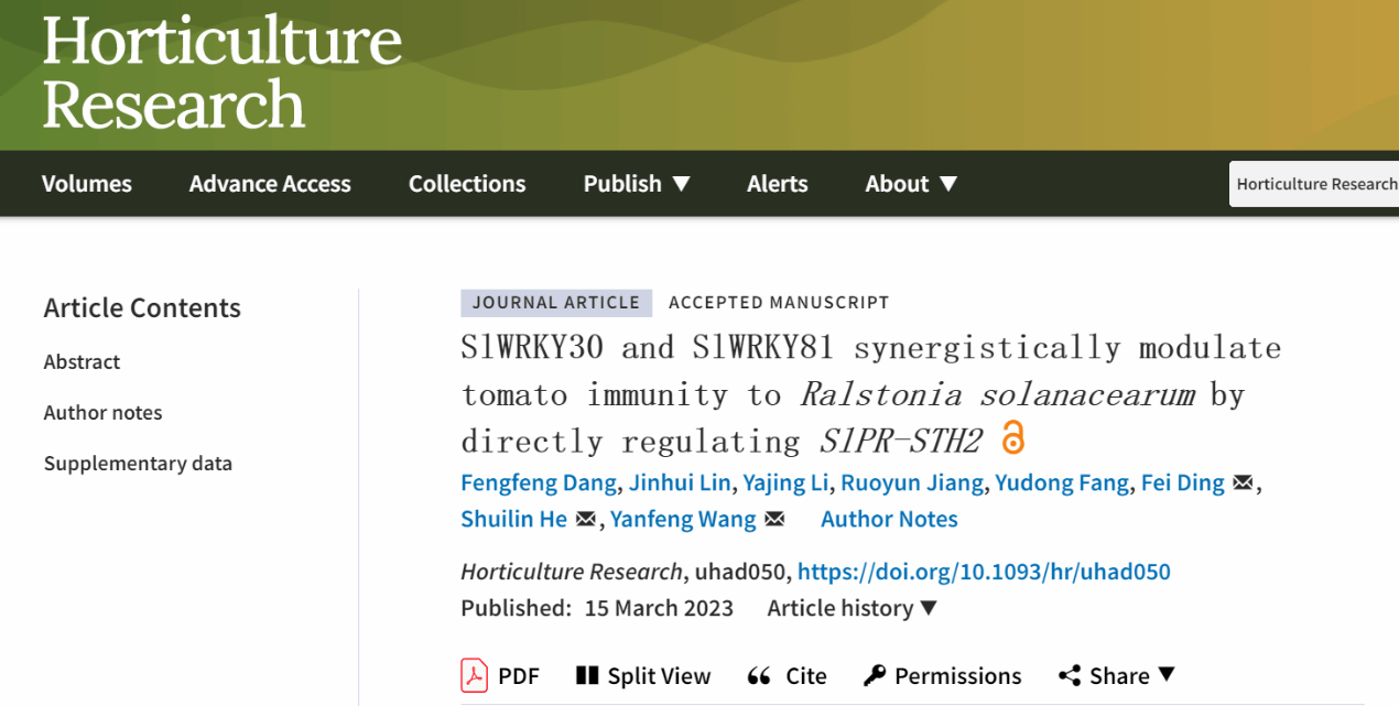 近日,公司王延峰教授和党峰峰博士与合作者在园艺领域的权威期刊Horticulture Research杂志(中科院一区TOP,中国科技期刊卓越行动计划领军类期刊)发表了题为“SlWRKY30 and SlWRKY81 synergistically modulate tomato immunity to Ralstonia solanacearum by directly regulating SlPR-STH2”的研究论文,揭示了“SlWRKY30-SlWRKY81”模块通过协同激活病原菌相关蛋白SlPR-STH2的表达提高番茄青枯病抗性的分子机制。公司王延峰教授、福建农林大学何水林教授和聊城大学丁飞副教授为本文共同通讯作者,党峰峰博士和福建农林大学的林金辉博士为本文共同第一作者。