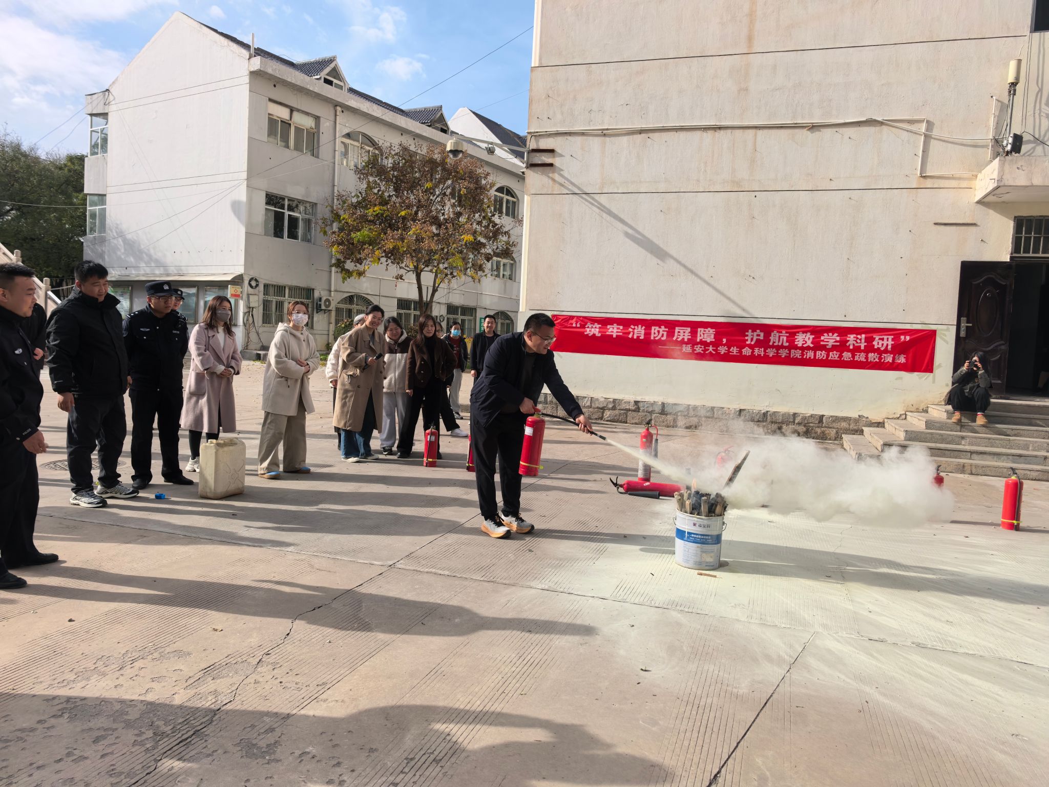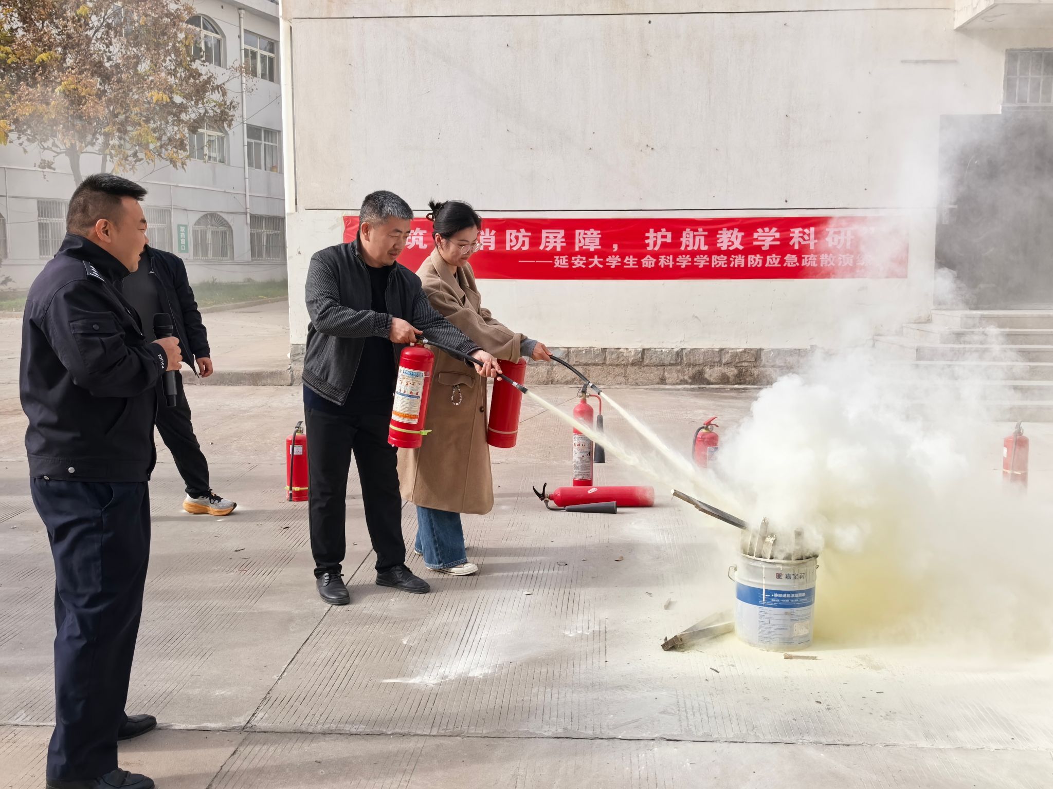 在消防知识讲解和灭火演示环节,保卫处的各位警官向在场的师生详细讲解了教学科研楼宇消防知识,现场演示了灭火器等消防器材的正确使用方法,部分师生现场进行了灭火器使用体验。副经理邓健对整个演练过程进行了总结点评,肯定了演练成效,再次重申了消防安全的重要性,宣布演练圆满结束。