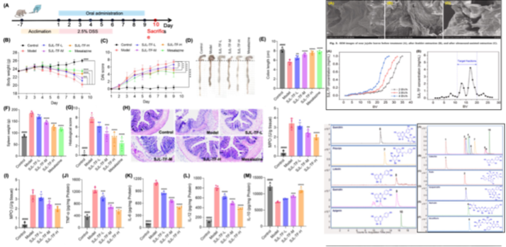 团队聚焦农业废弃物的生态价值挖掘,以药食同源植物酸枣叶为突破口,通过自主研发的超声辅助-响应面法(UAE-RSM)绿色提取工艺,高效富集酸枣叶总黄酮(SJL-TF),建立“绿色提取纯化-精准成分解析-病理干预机制阐明”一体化链条。通过动物实验和细胞实验证实SJL-TF通过调节免疫、修复肠道微生物生态平衡及黏膜屏障,显著缓解UC,推动UC的治疗从“对症治疗”向“病因生态干预”的策略转变。该技术体系大幅降低了能耗与溶剂污染风险,有力促进了生态资源的循环利用,成果发表于中科院一区TOP国际期刊Ultrasonics Sonochemistry(IF=9.7,2025年)[1]。