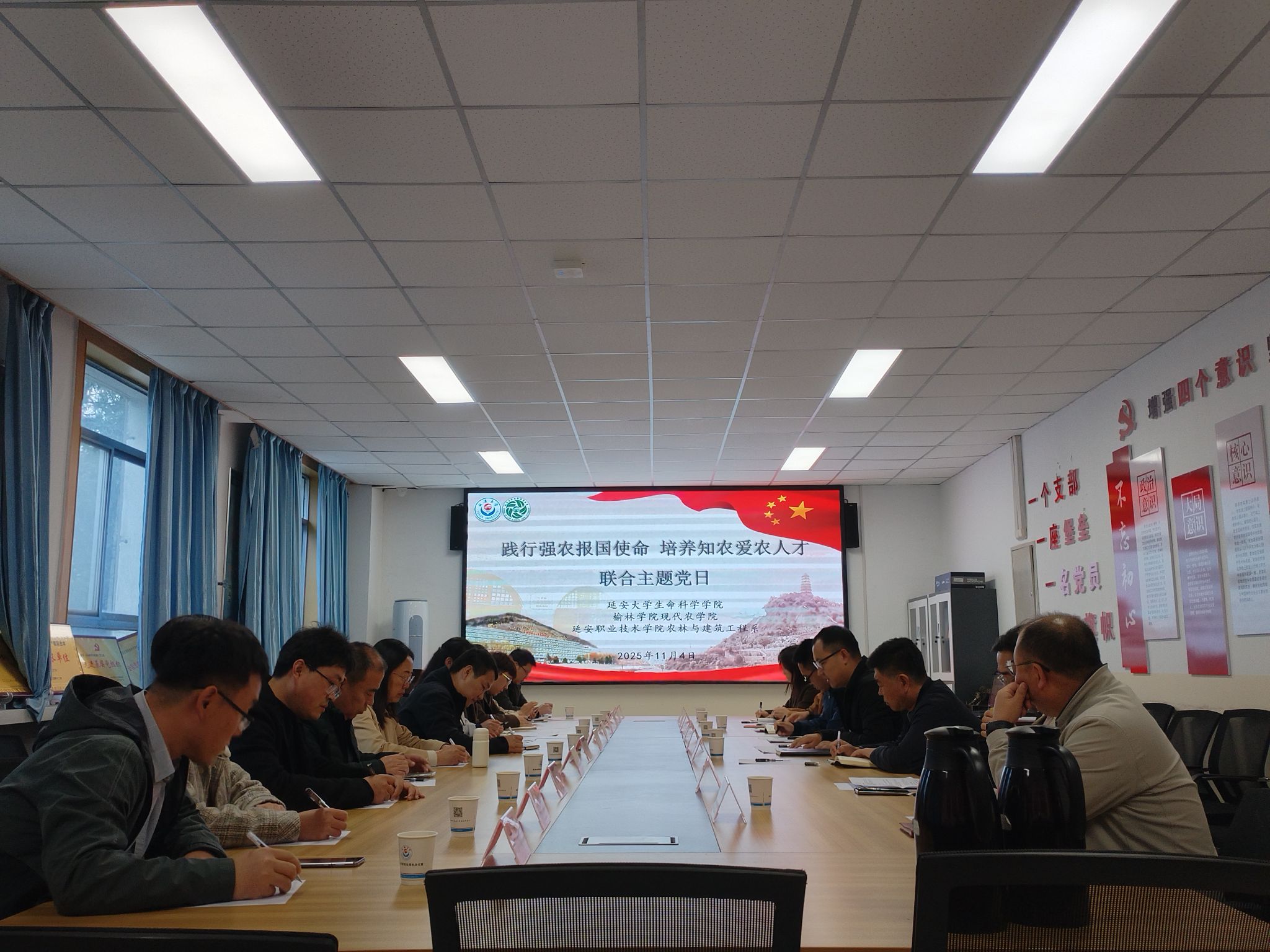 为深入学习贯彻党的二十届四中全会精神和习近平总书记给中国农业大学全体师生的回信精神,推动涉农高公司党建与业务深度融合,2025年11月4日下午,yl6809永利、榆林学院现代农学院、延安职业技术学院农林与建筑工程系在永利集团杨家岭校区yl6809永利会议室联合举办“践行强农报国使命 培养知农爱农人才”主题党日和人才培养交流座谈会。yl6809永利副经理、生态学科教工党支部书记邓建、榆林学院现代农学院副经理严加坤、延安职业技术学院农林与建筑工程系副主任、党总支纪检委员姚延琴和三个院系教研室负责人、党员和教师代表共30余人参加活动,会议由邓健主持。