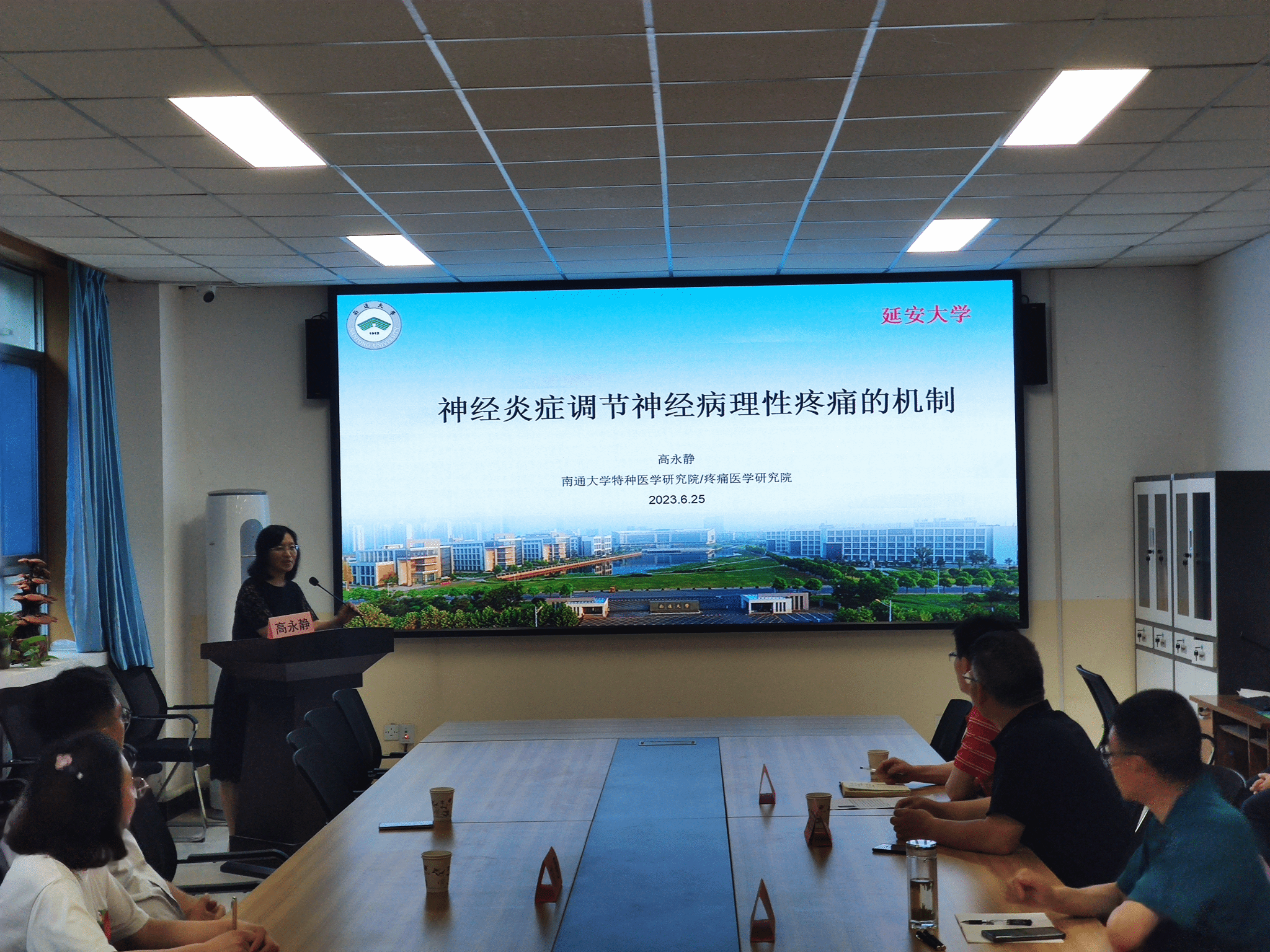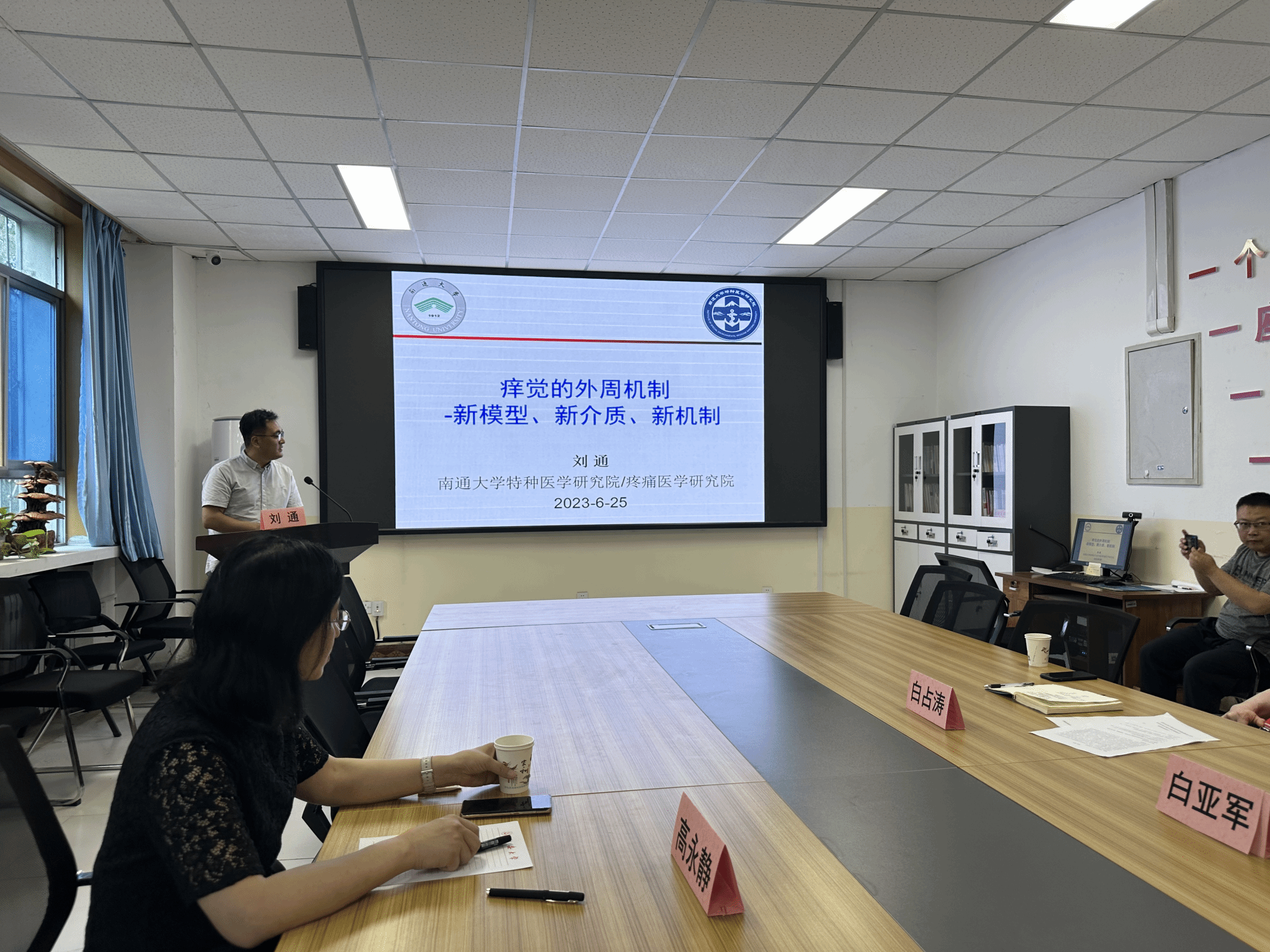 2023年6月25日上午,南通大学特种医学研究院高永静教授、刘通教授,受邀在永利集团杨家岭校区特立楼二楼会议室为公司师生作题为“神经炎症调节神经病理性疼痛的机制”和“瘙痒外周机制的研究进展”的学术报告。报告会上,高永静教授就神经炎症调节神经病理性疼痛的趋化因子调控,神经细胞疼痛刺激趋化因子相关受体类型与表达的变化分析,疼痛下突触传输增强的多种基因参与感受调控等研究内容展开了细致严谨的汇报。刘通教授对瘙痒的外周机制的历史、主流科学假说、研究进展与动物模型建立做了系统的梳理与总结,并分享了课题组关于五羟色胺和瞬时感觉通道-4亚型参与的痒觉调控发生新机制的研究成果,两位教授的精彩报告引起台下教师们和研究生们的热烈讨论。