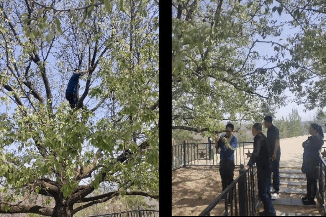 应吴起县中央红军长征胜利纪念园负责人的邀请,李广伟副教授就纪念园内杜梨树感染的病害进行了诊断。纪念园内的两棵“杜梨树”见证了红军长征“切尾巴”战役的胜利,毛泽东同志在登上吴起平台山时在这两棵杜梨树下召开了战前动员大会,在长征历史上被赋予了特殊的意义。经过现场踏查与诊断,李广伟副教授初步判断该树遭受了梨锈病和枝枯病病菌的混合侵染,根据具体情况制定了以防治两种病害为主、加强营养增强树势为辅的预防和治疗方案,促进杜梨树的恢复和健康成长。